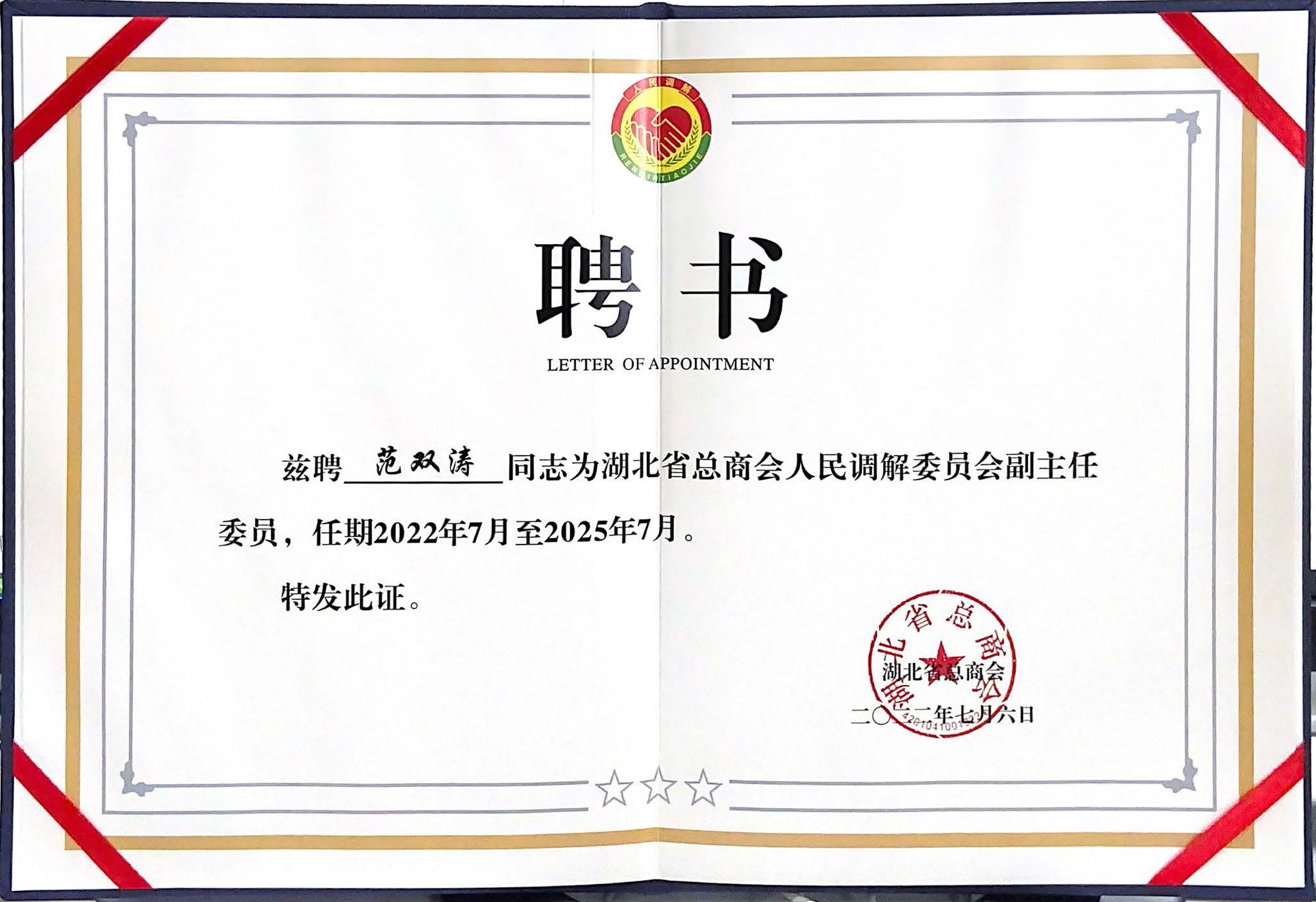 2022年7月6日,湖北省總商會(huì )人民調解委員會(huì )全體會(huì )議在武漢順利召開(kāi)。公司董事長(cháng)范雙濤受聘為湖北省總商會(huì )人民調解委員會(huì )副主任委員。