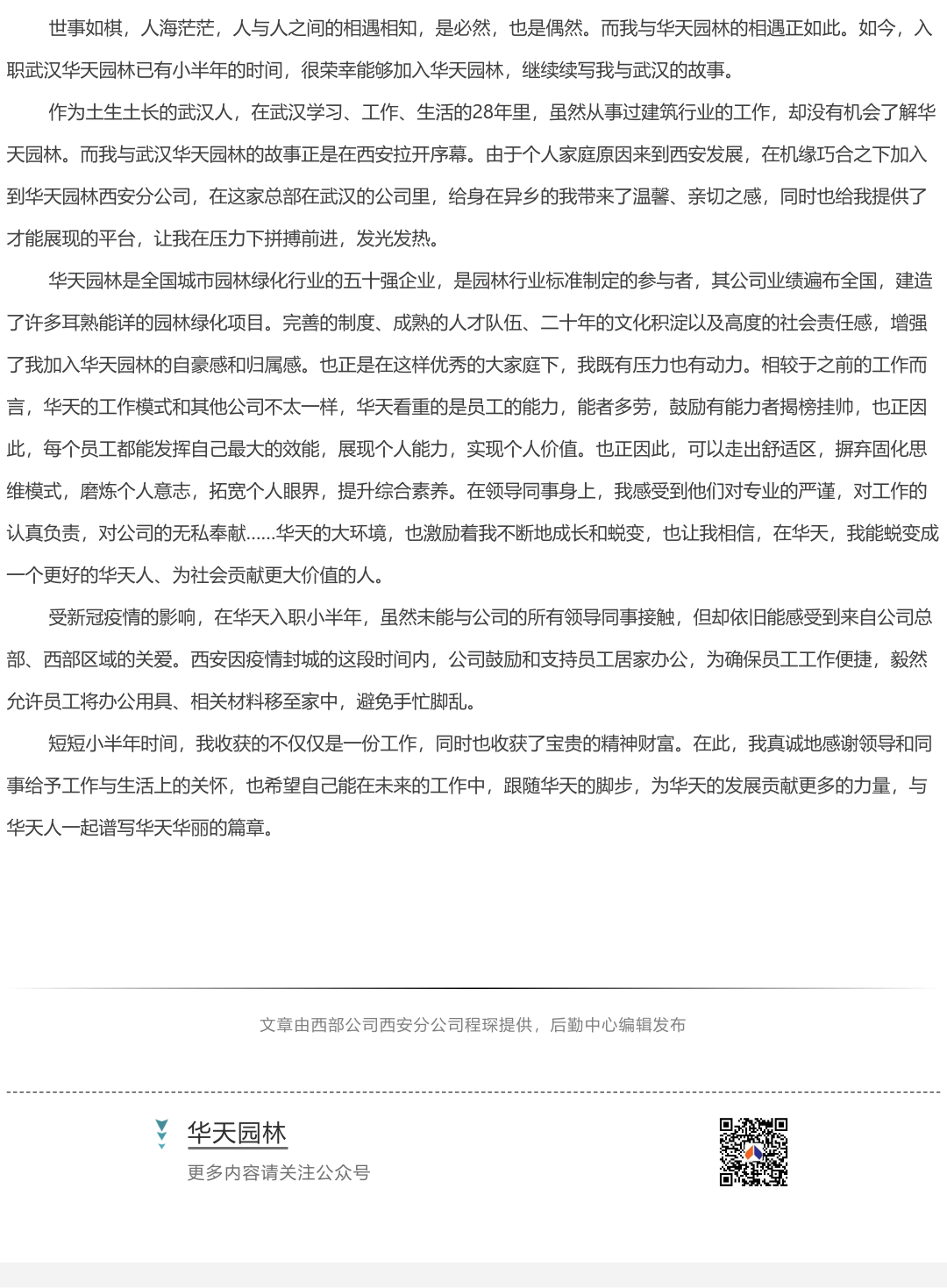 【概要描述】世事如棋,人海茫茫,人與人之間的相遇相知,是必然,也是偶然。而我與華天園林的相遇正如此。如今,入職武漢華天園林已有小半年的時(shí)間,很榮幸能夠加入華天園林,繼續續寫(xiě)我與武漢的故事。