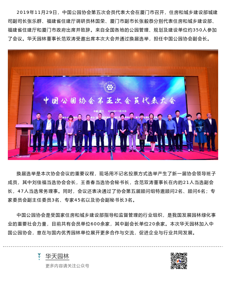 【概要描述】2019年11月29日,中國公園協(xié)會(huì )第五次會(huì )員代表大會(huì )在廈門(mén)市召開(kāi),住房和城鄉建設部城建司副司長(cháng)張樂(lè )群、福建省住建廳調研員林國榮、廈門(mén)市副市長(cháng)張毅恭分別代表住房和城鄉建設部、福建省住建廳和廈門(mén)市政府出席并致辭。來(lái)自全國各地的公園管理、規劃及建設單位約350人參加了會(huì )議。華天園林董事長(cháng)范雙濤受邀出席本次大會(huì )并通過(guò)換屆選舉,擔任中國公園協(xié)會(huì )副會(huì )長(cháng)。