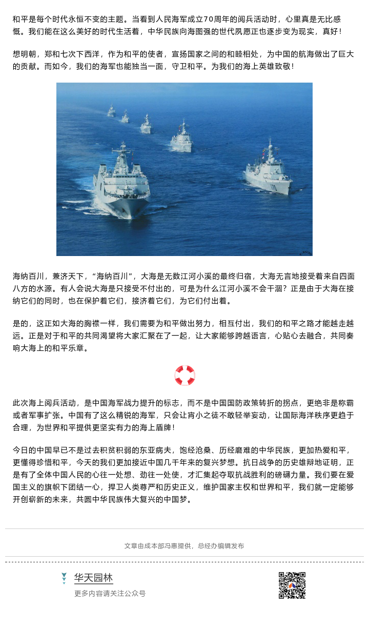 【概要描述】和平是每個(gè)時(shí)代永恒不變的主題。當看到人民海軍成立70周年的閱兵活動(dòng)時(shí),心里真是無(wú)比感慨。我們能在這么美好的時(shí)代生活著(zhù),中華民族向海圖強的世代夙愿正也逐步變?yōu)楝F實(shí),真好!