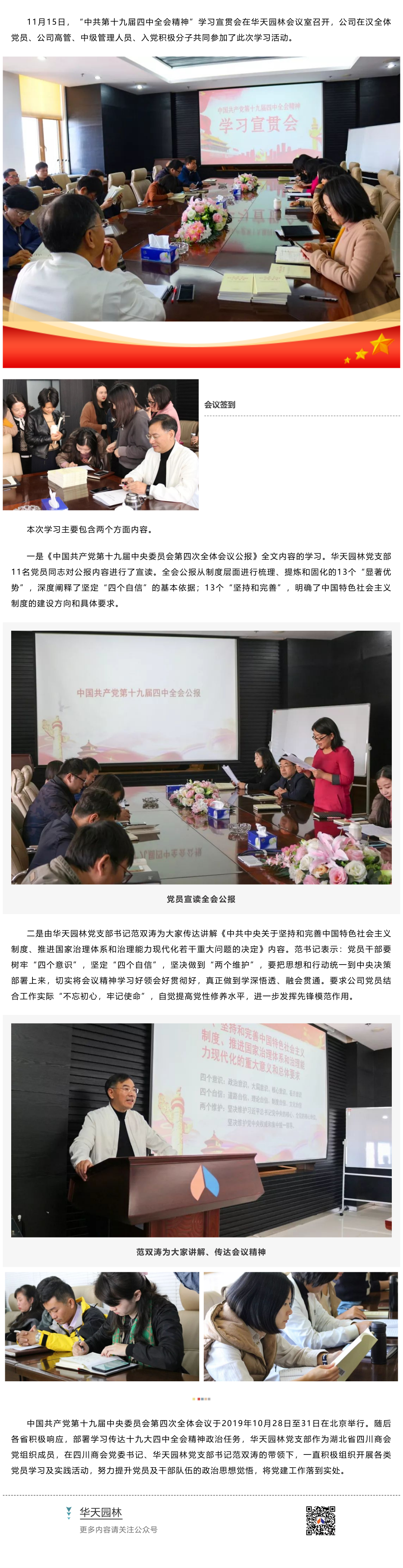 【概要描述】2019年11月15日,“中共第十九屆四中全會(huì )精神”學(xué)習宣貫會(huì )在華天園林會(huì )議室召開(kāi),公司在漢全體黨員、公司高管、中級管理人員、入黨積極分子共同參加了此次學(xué)習活動(dòng)。