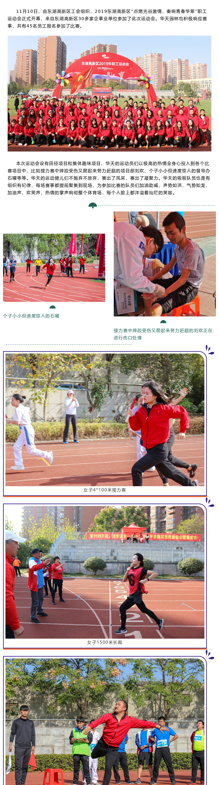 【概要描述】11月10日,由東湖高新區(qū)工會組織,2019東湖高新區(qū)“點燃光谷激情,奏響青春華章”職工運動會正式開幕,來自東湖高新區(qū)30多家企事業(yè)單位參加了此次運動會。華天園林也積極響應(yīng)賽事,共有45名員工報名參加了比賽。